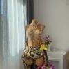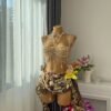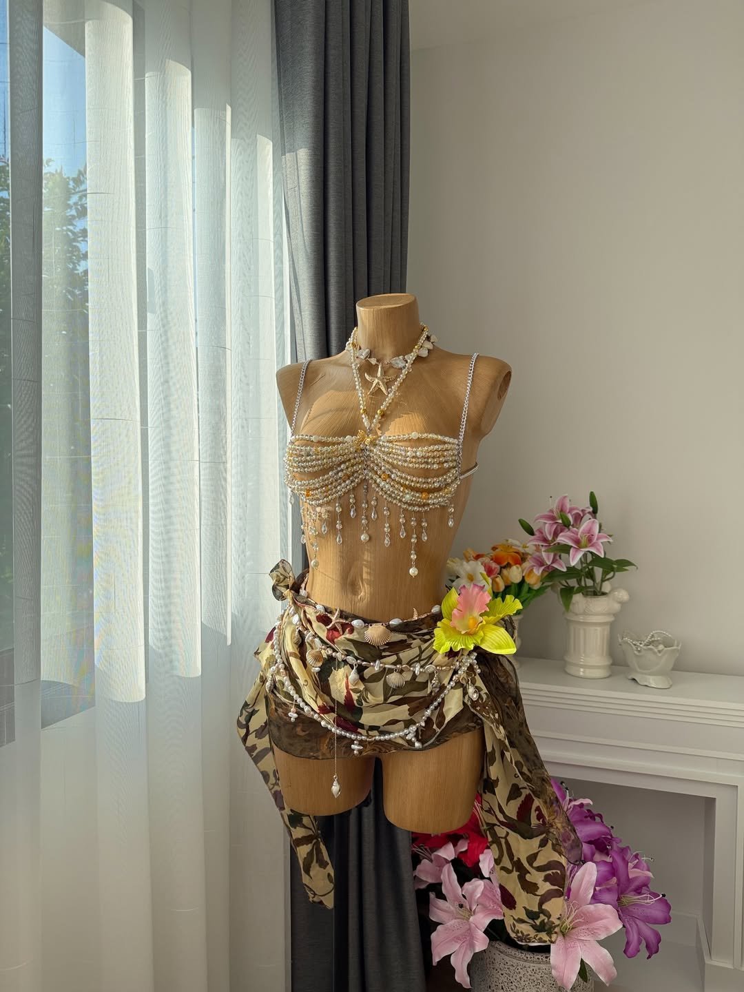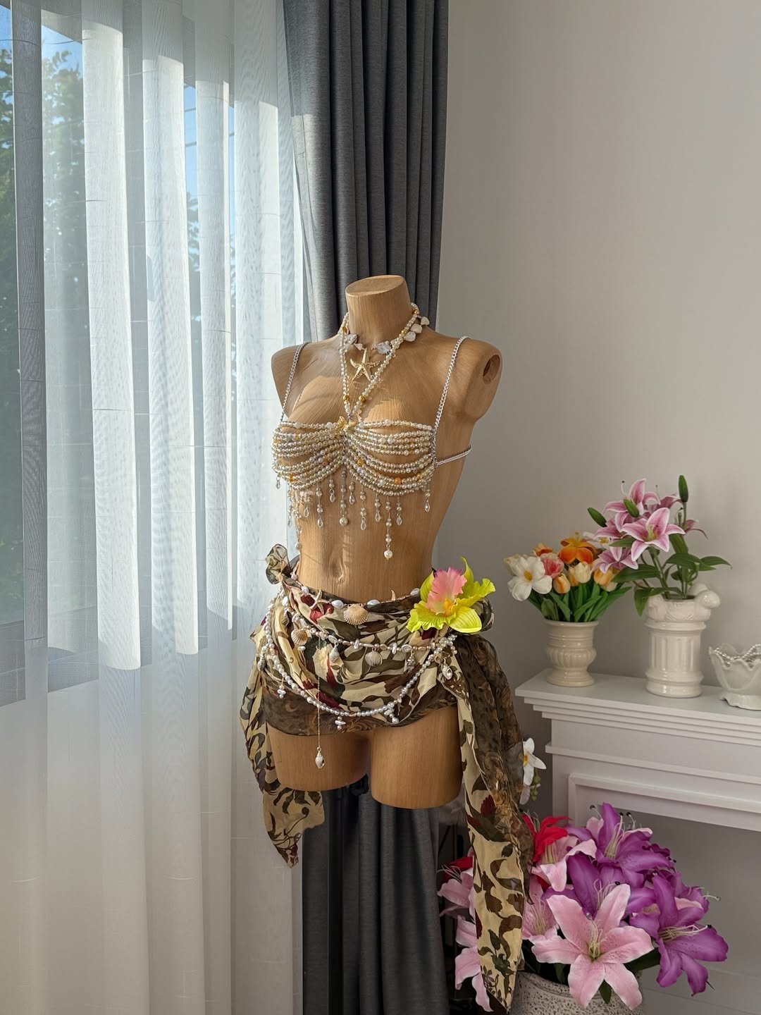A saia apresenta tecido fluido com estampa em tons terrosos e detalhes em pérolas e conchas, criando um visual harmônico e orgânico. As aplicações no quadril valorizam os movimentos da dança, tornando o conjunto ideal para dança do ventre, apresentações artísticas, espetáculos e ensaios fotográficos.
